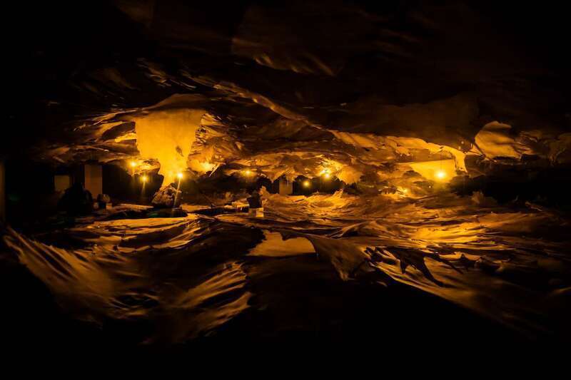 作为核心个展,邬建安“第八十天”以特定场域大型装置回应晋城“神话之乡”文化根脉,围绕女娲补天神话,构建神话与现实交织的沉浸现场。作品聚焦补天第八十日的临界时刻,通过天然材料与综合媒材塑造“天空裂痕”意象,引导观众思考破坏与修复、混沌与秩序之间的状态。